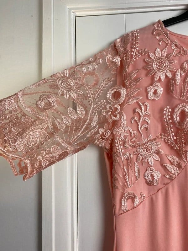 SHEIN Pink Lace Embroidered Bodycon Midi Dress
