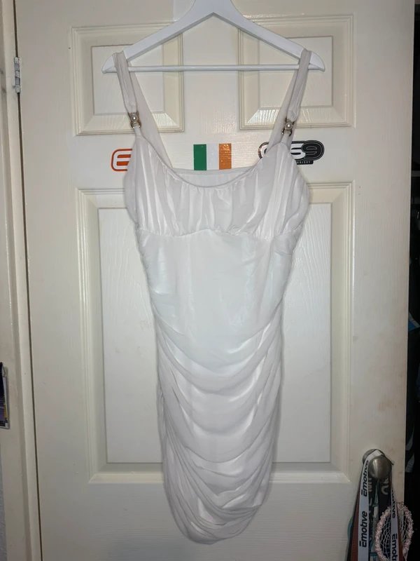 The Shein White Ruched Bodycon Mini Dress is available in sizes L.