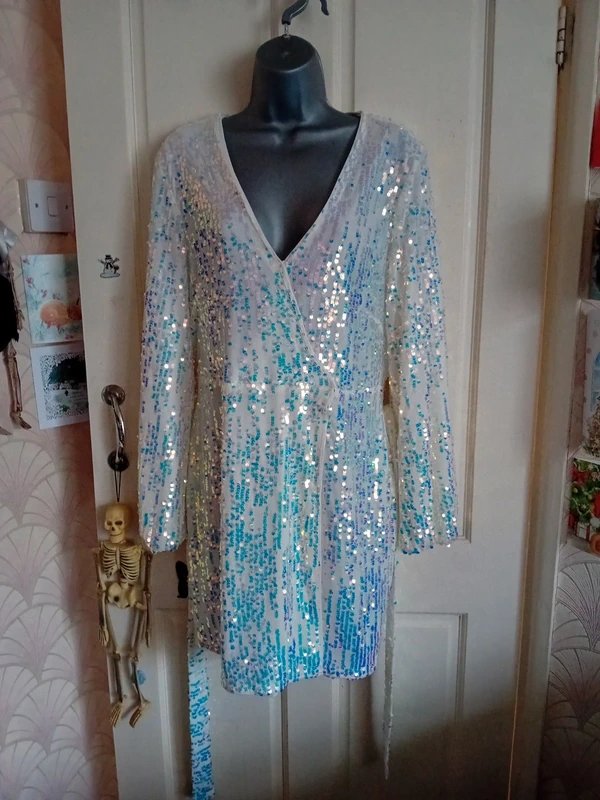 Beautiful White Sequin Mini Dress — the must-have occasion dress for parties and special events. Designed in vibrant white with blue and pink sequins, this mini dress features a full zip at the back and removable belt. Crafted from stretchy fabric with elasticated cuffs for a comfortable fit. Includes a fully lined interior for coverage. Perfect for evening events and parties.