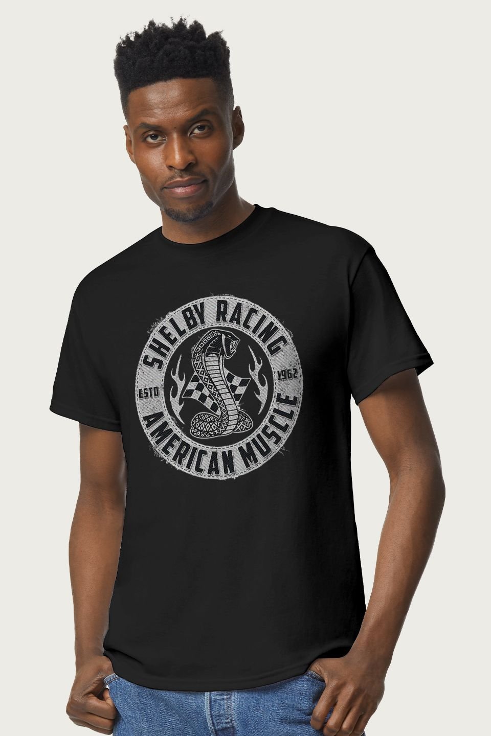 Officially licensed Shelby apparel. This black cotton t-shirt features a crew neck and a graphic print of the iconic Shelby logo. Perfect for a casual, all-season look.