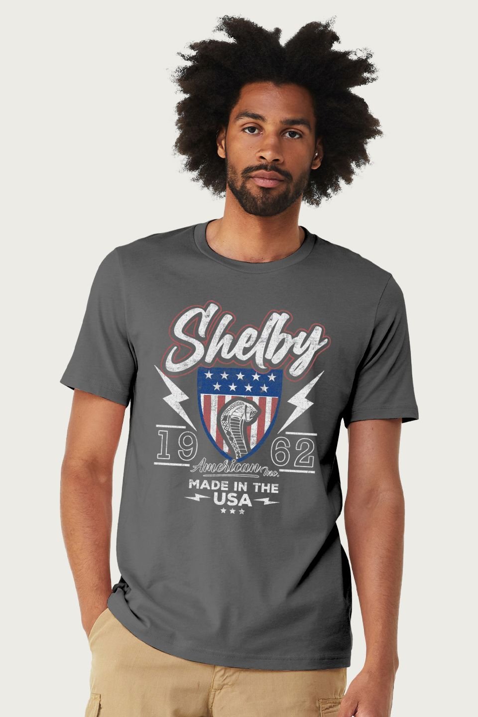 Officially licensed Shelby apparel. This charcoal mid-weight cotton t-shirt features a crew neck and a bold graphic print. Perfect for casual wear, it offers comfort and durability.