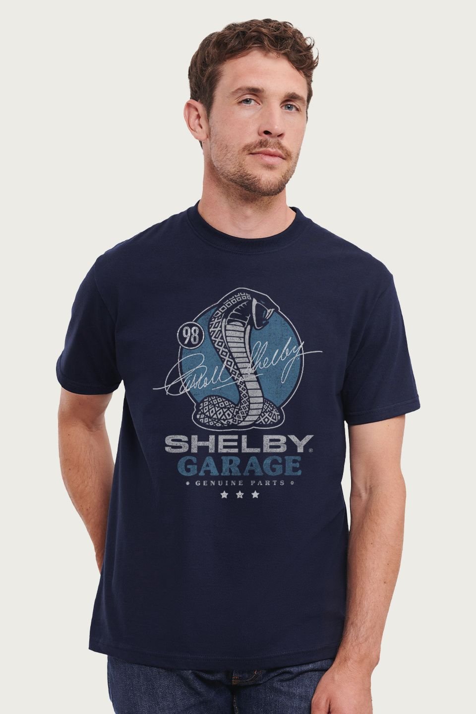 Officially licensed Shelby apparel. This navy blue mid-weight cotton t-shirt features a crew neck and a graphic print with a cobra emblem. Designed for all-season wear, it promises comfort and durability.