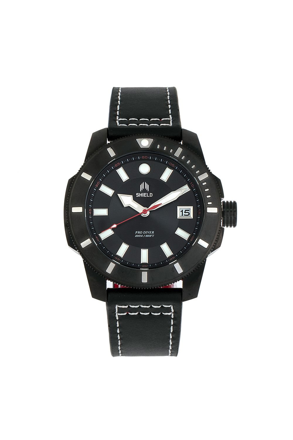 The Shield Black Leather-Band Diver Watch with Date is ideal for casual, outdoor, everyday.