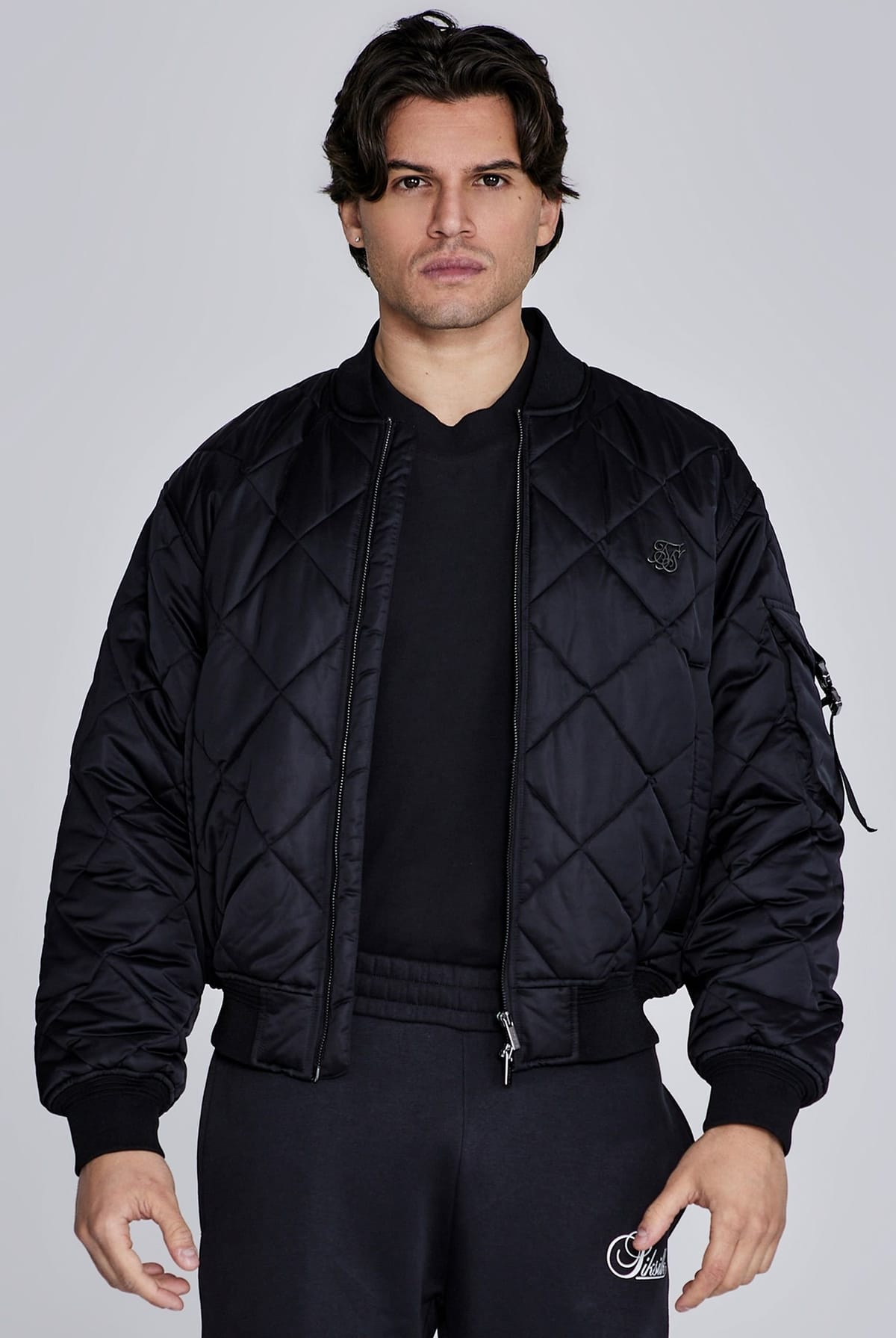 The SikSilk Men's Black Quilted Bomber Jacket is available in sizes s.