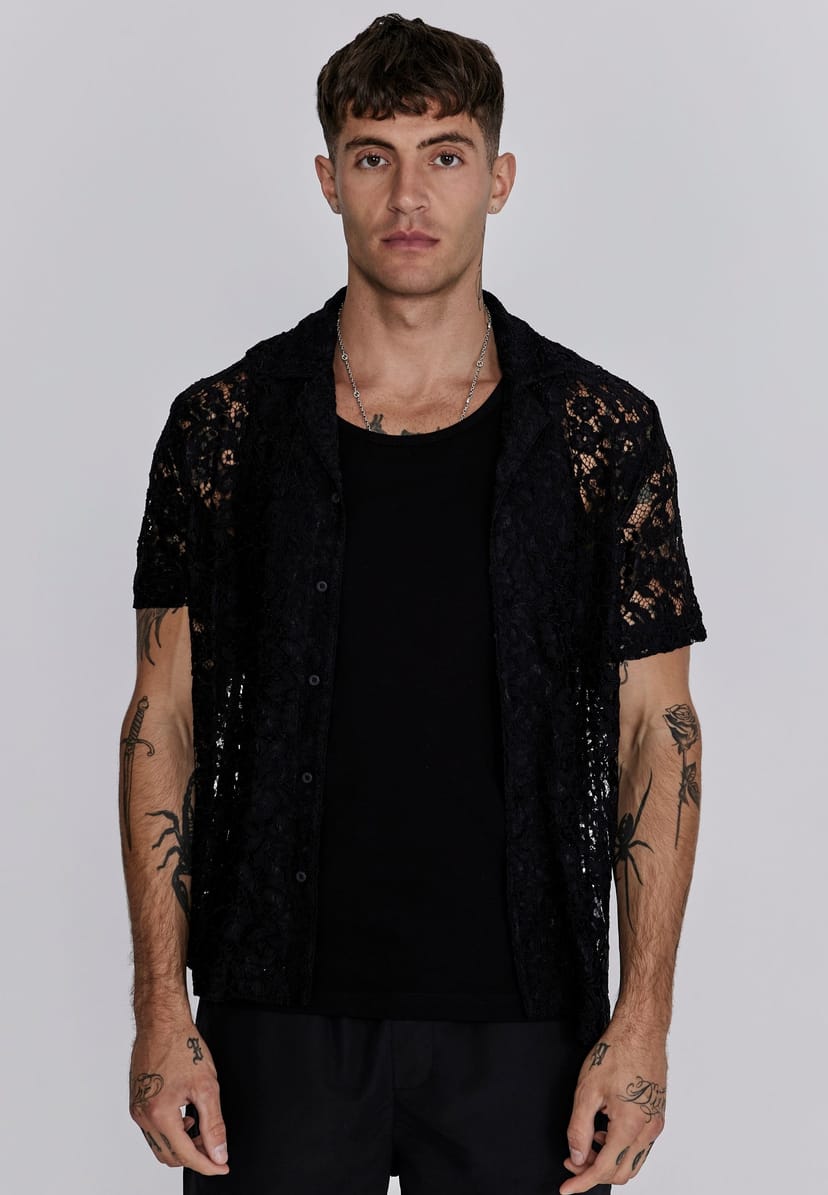 Stylish black lace resort shirt by SikSilk. Features intricate lace detailing and a relaxed fit. Ideal for casual outings or beachwear.