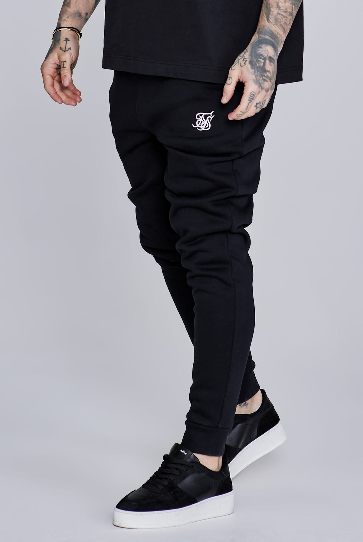 Stylish black joggers by SikSilk, crafted from a soft cotton blend for ultimate comfort. Featuring a drawstring waistband and branded logo on the leg, these joggers are perfect for a casual day out or a relaxed evening.
