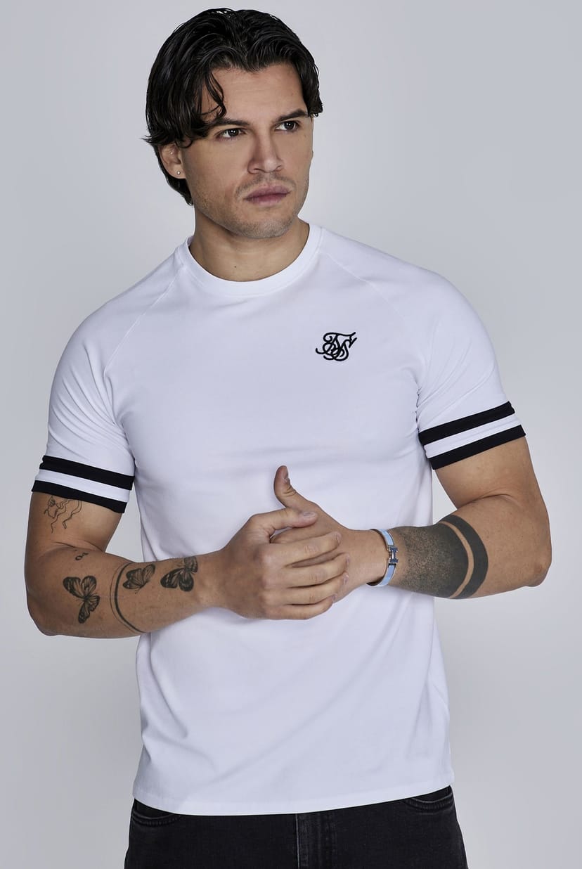 Stylish SikSilk Men's Tournament T-Shirt in white with black striped details on the shoulders and sleeves. Perfect for a casual yet trendy look.