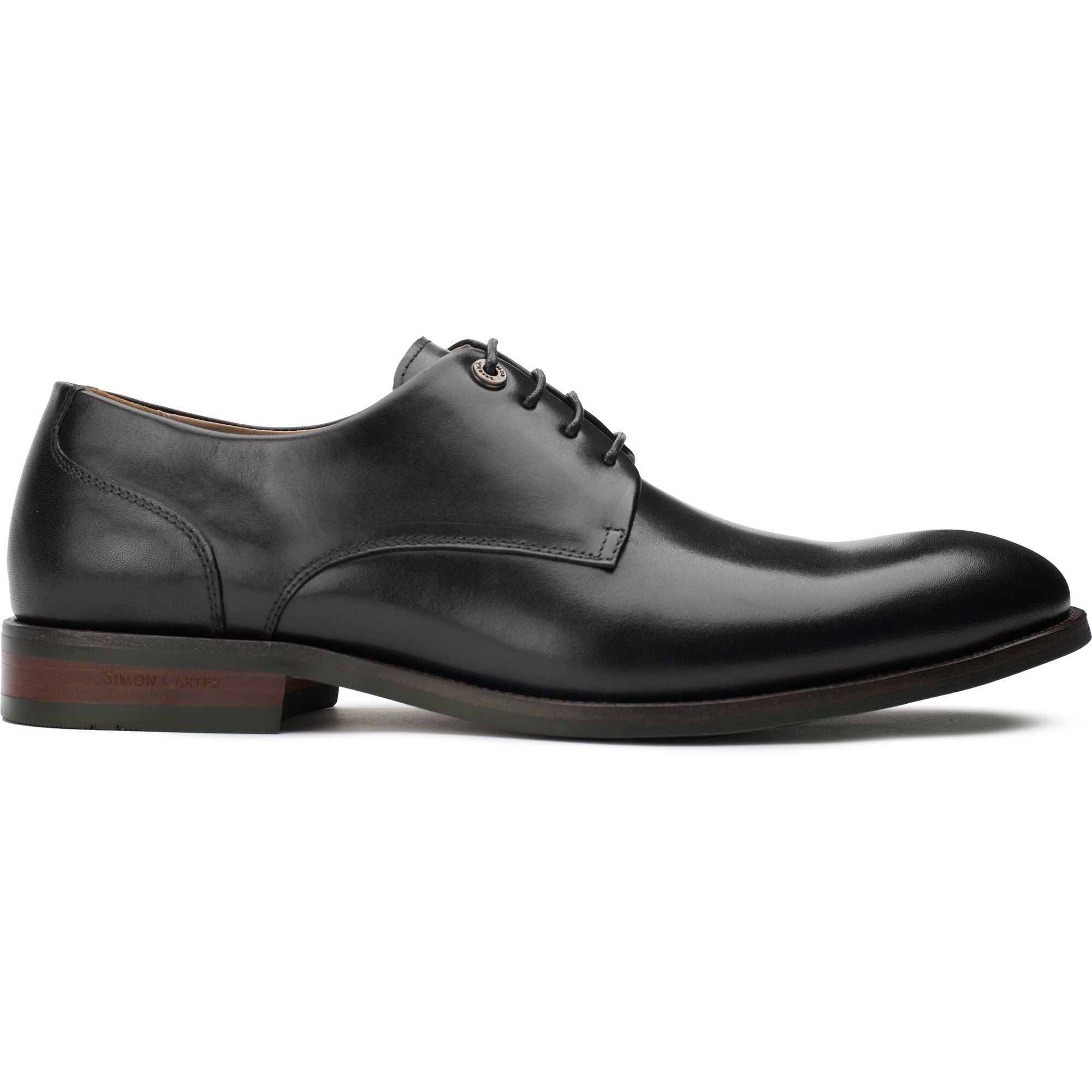 Elegant black leather derby shoes by Simon Carter. Crafted from premium leather, these shoes offer a sleek and sophisticated design. Perfect for formal and casual occasions, they feature a leather lining and dainite sole for comfort and durability.