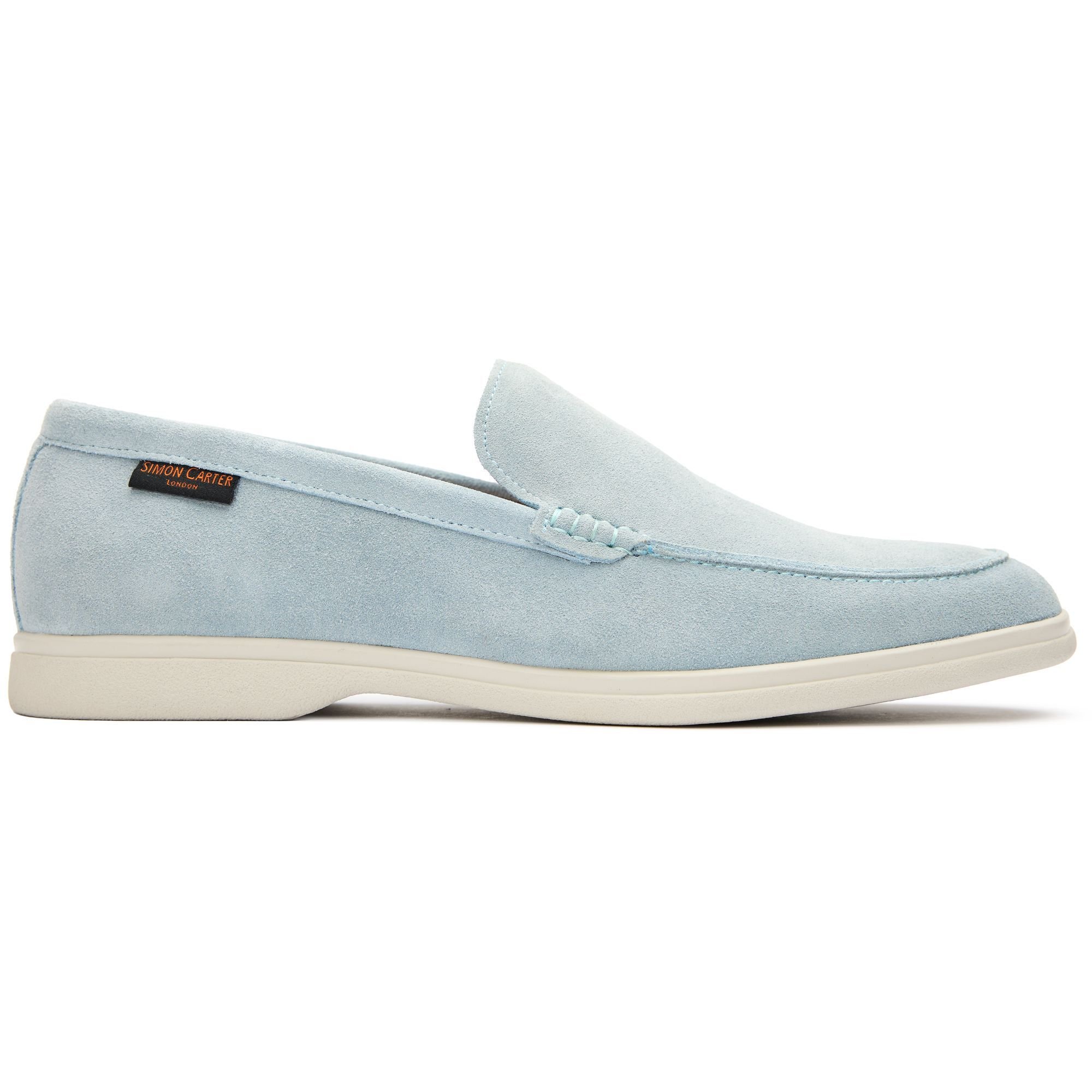 These refined light blue suede loafers from Simon Carter blend sophistication with playful character. The Tanius slip-ons showcase the brand's attention to detail with premium leather lining and a whimsical dinosaur print interior that adds a subtle touch of personality. The durable rubber sole ensures comfort and durability.