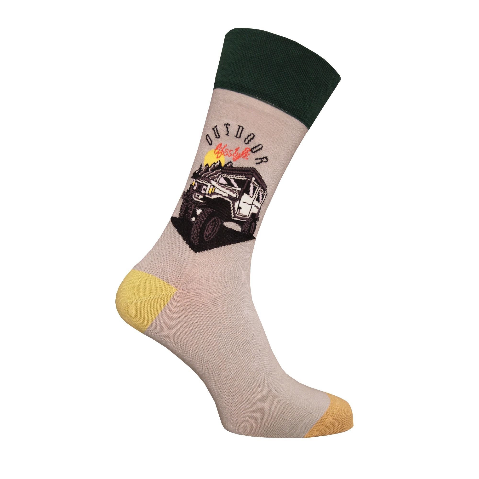 Trendy Mint socks with a Safari Truck design. Made from 80% Cotton, 18% Polyamid, 2% Elastane, these socks offer a stretchy fit and reinforced heel and toe for durability. Ideal for casual wear.
