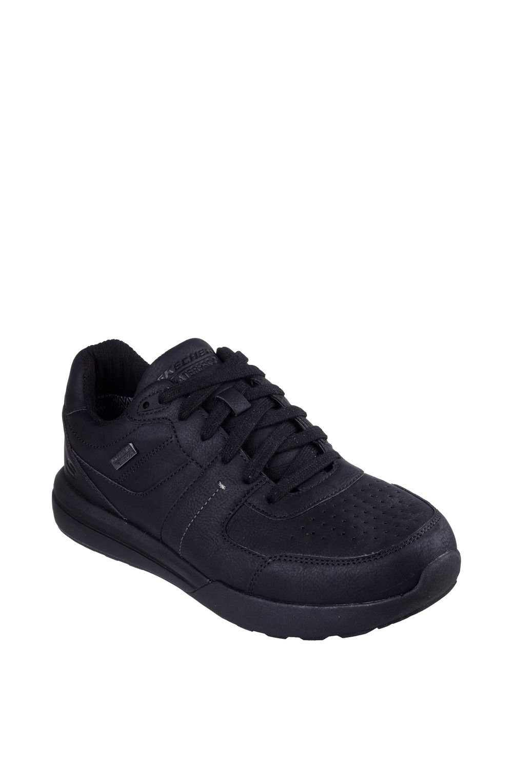 Stylish black leather lace-up shoes with a waterproof design. Features Goga Mat Arch Fit support and a Skechers Air-Cooled Memory Foam insole for ultimate comfort.