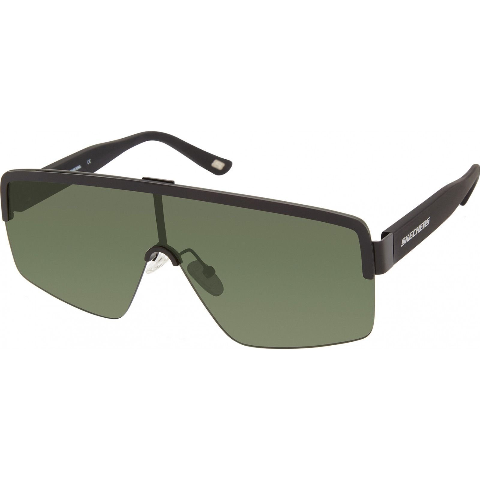 Stylish Skechers SE6199-0002N Shield Sunglasses in black with green lenses. Made from durable materials, these sunglasses offer a sleek, modern look perfect for everyday wear.