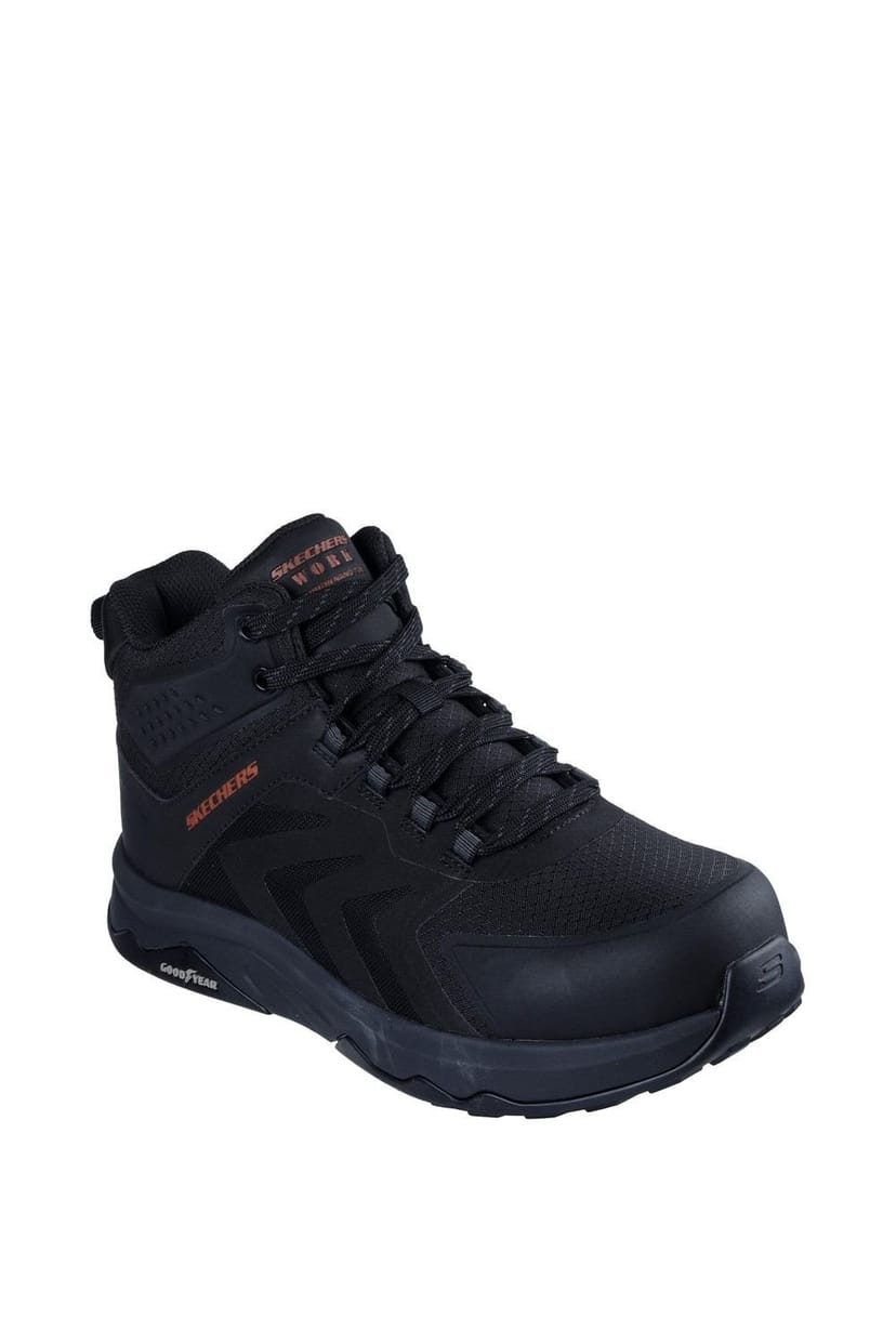 Slip-resistant high-top lace-up safety boots in black. Features a synthetic and mesh upper with a carbon nano toe, Skechers Air-Cooled Memory Foam insole, and Goodyear Rubber Outsole. Ideal for comfort and protection.