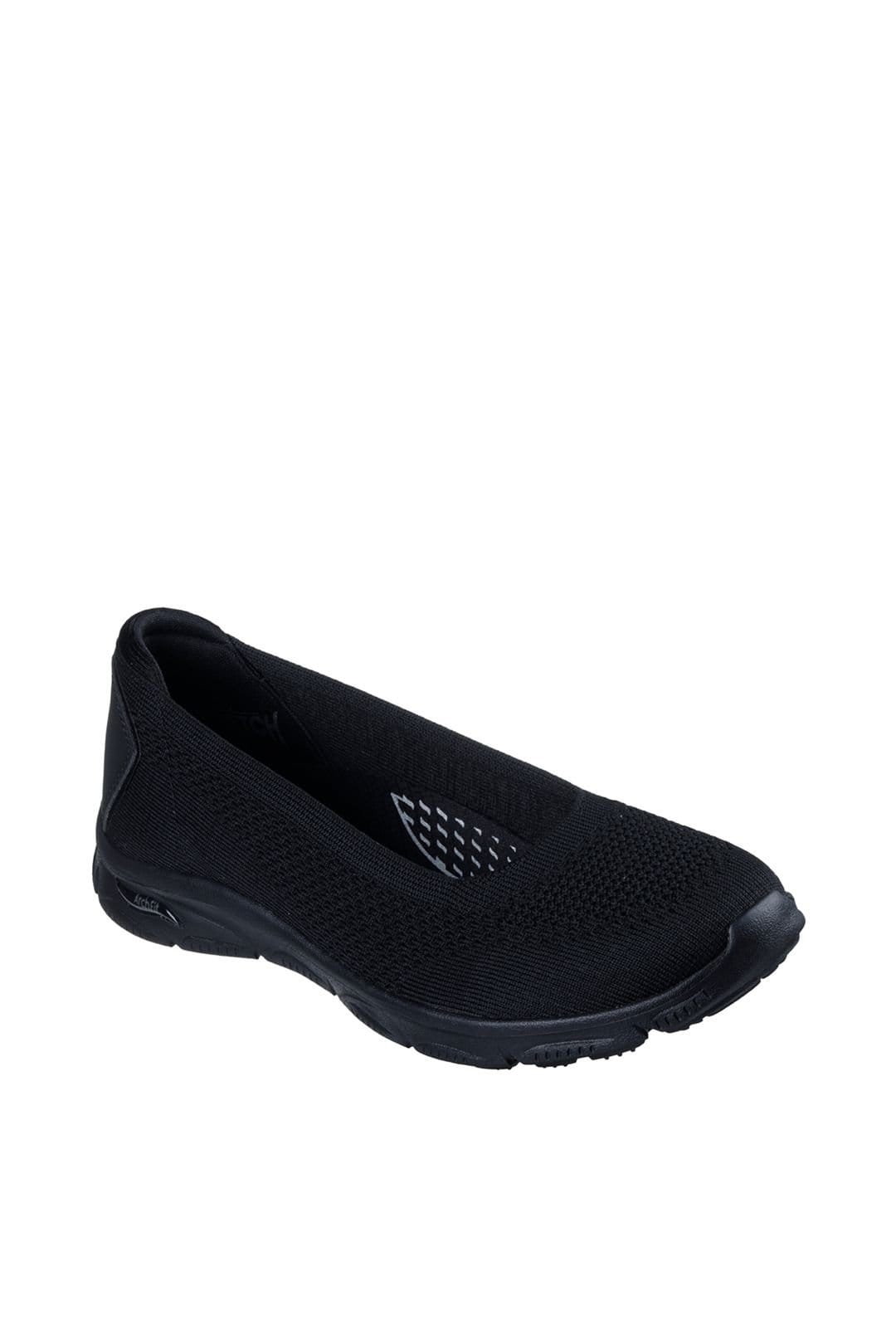 Stylish Skechers Arch Fit Sunny Zen Walk slip-on shoes in black. Featuring breathable knit upper with strategic ventilation for all-day comfort. Slip-on design with stretchy collar for effortless wear. Lightweight cushioned sole perfect for extended walking. Textured outsole providing reliable grip.
