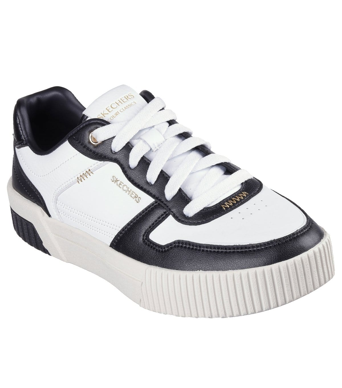Stylish Skechers trainers in white faux leather with a black accent. Featuring a chunky white sole and lace-up fastening, these trainers are perfect for a casual yet trendy look.