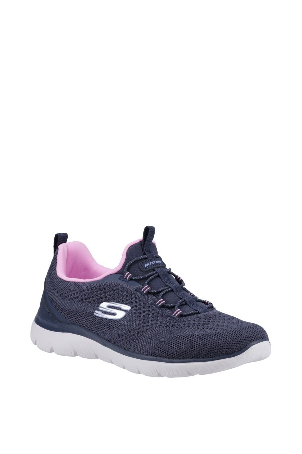 Stylish Skechers Summits New Nature shoes in navy. Designed for athletic style and comfort, these shoes feature an engineered knit upper with stretch laces and a cushioned Memory Foam insole. Ideal for everyday wear.