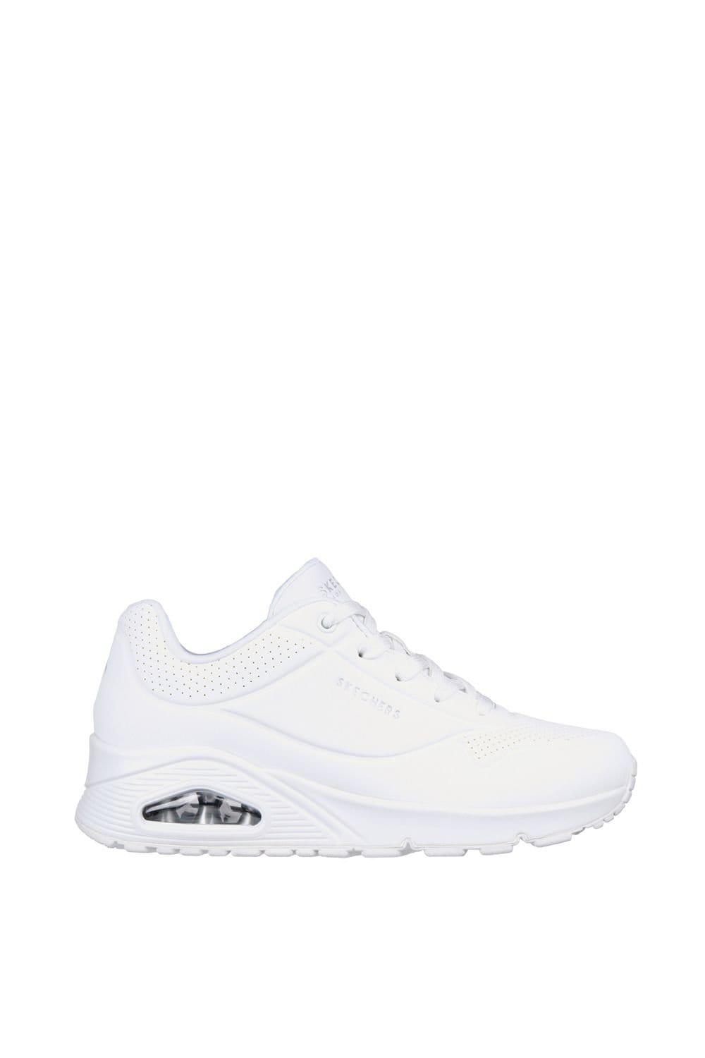 The Skechers Women's UNO White Trainers is available in sizes 4, 5, 6, 7, 8.