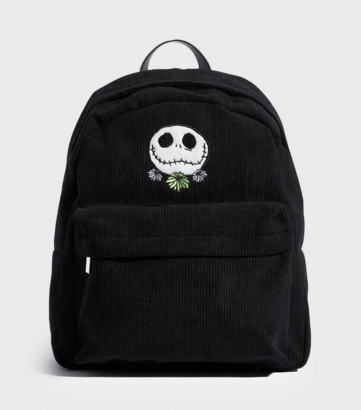 This black corduroy backpack from Skinnydip features a Nightmare Before Christmas embroidery design. It includes faux leather trims, a zipped exterior pocket, and a back logo plaque.