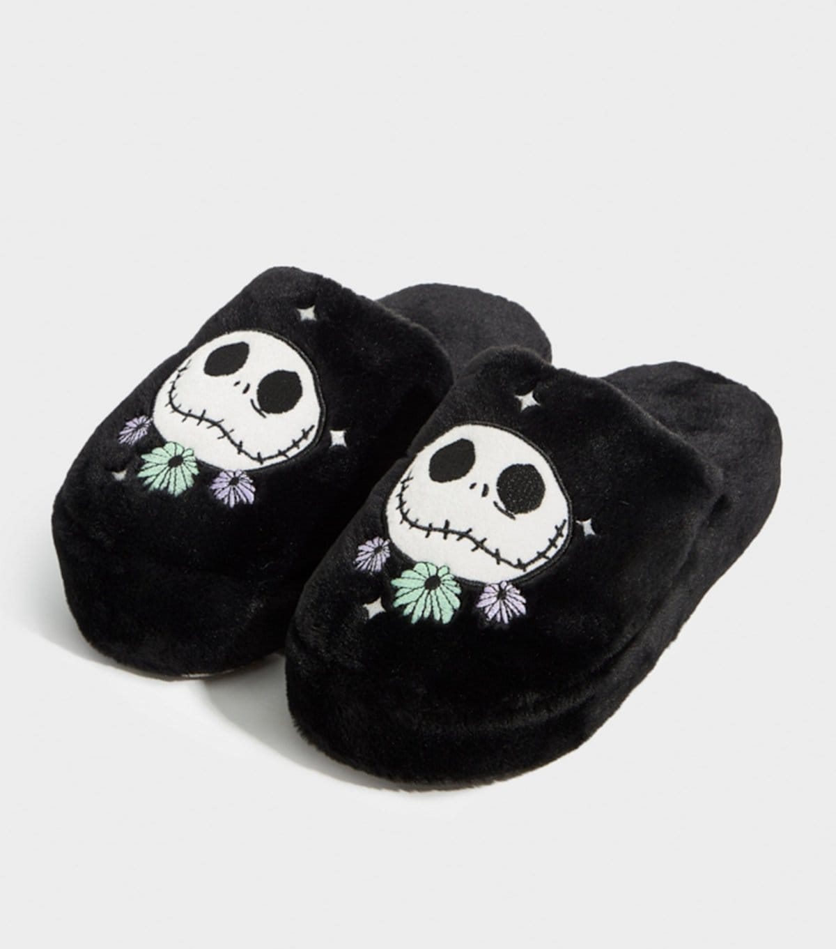 Cozy black embroidered slippers featuring a spooky Nightmare Before Christmas design. The fluffy faux fur interior ensures snug feet for the Halloween season and beyond.