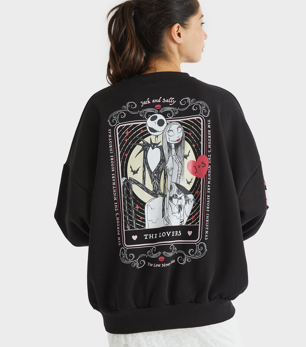 Trendy black sweatshirt from Skinnydip featuring a Nightmare Before Christmas graphic print. Made from jersey fabric, it offers a relaxed fit and is perfect for casual wear.