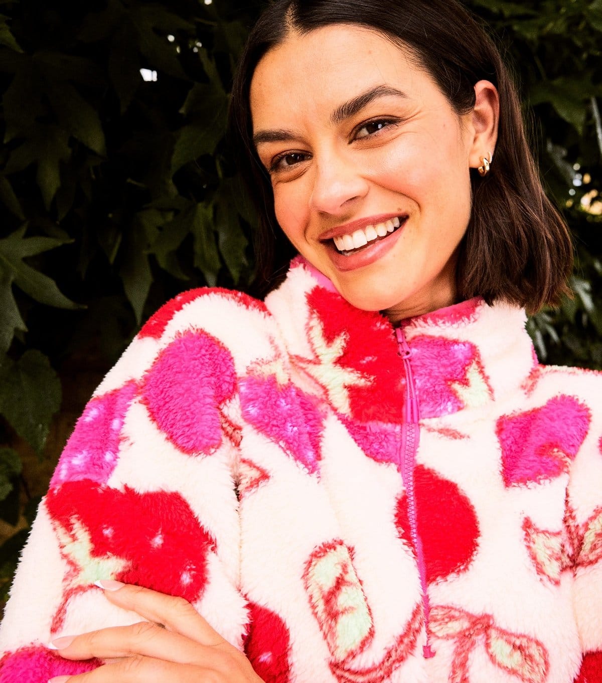 Playful berry-patterned quarter-zip sweatshirt from Skinnydip. Made from soft fleece, this longline top is perfect for layering over knits for extra warmth.