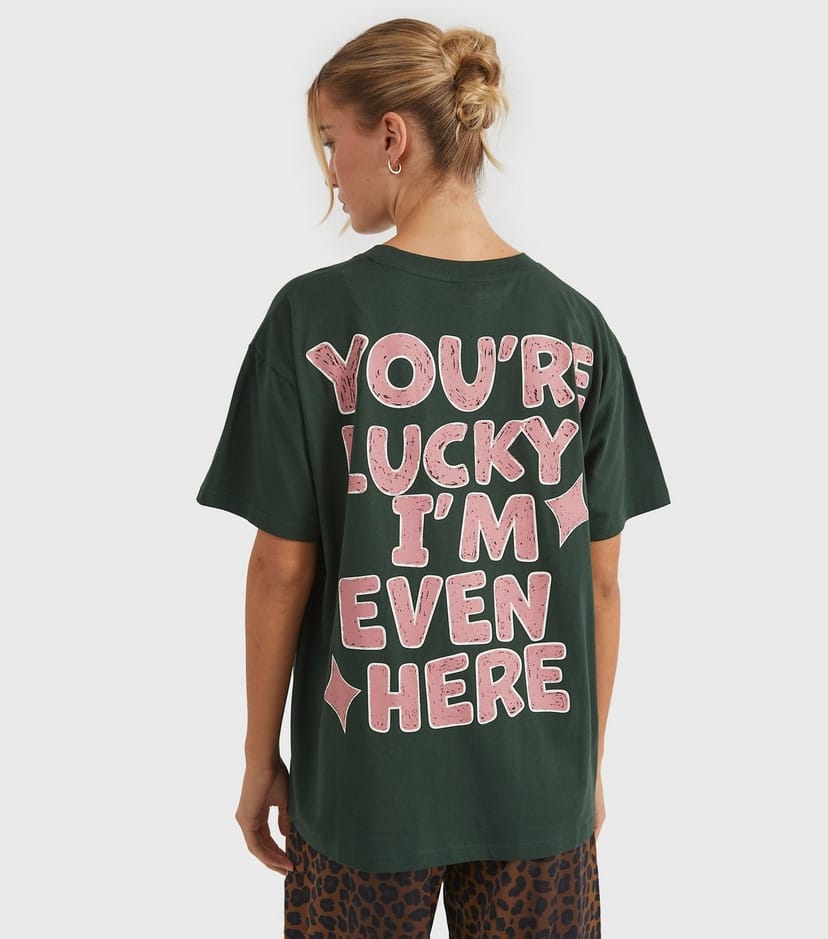 Casual green cotton t-shirt from Skinnydip, featuring a bold back logo. Ideal for casual hangouts, this tee adds a cheeky touch to your look.