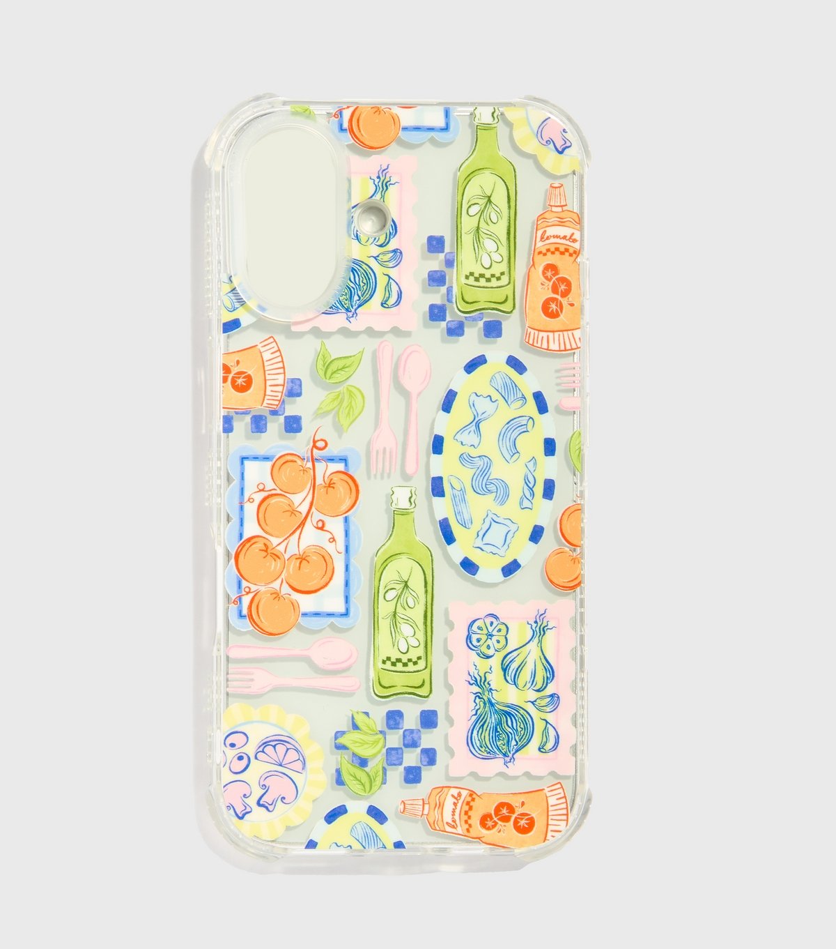 Vibrant patchwork pasta print on a transparent/green phone case. Made from hard shell material, it features anti-slip dotted grip edges and anti-shock bumper corners. Ideal for protecting your phone with style.