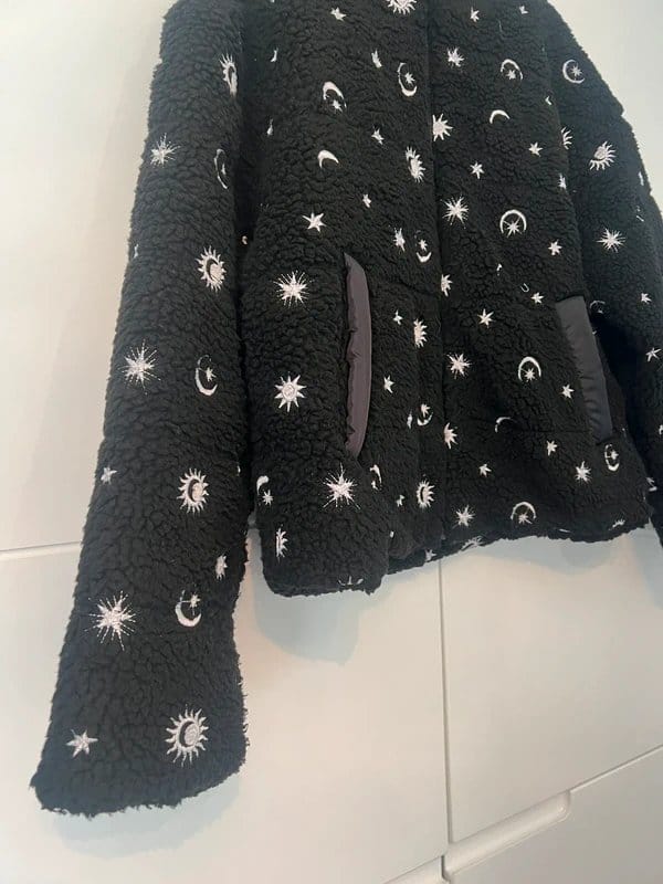 This black teddy coat by Skinnydip features a cosmic design with celestial bodies and stars. Made from fluffy teddy fabric, it's perfect for a cozy yet stylish look.