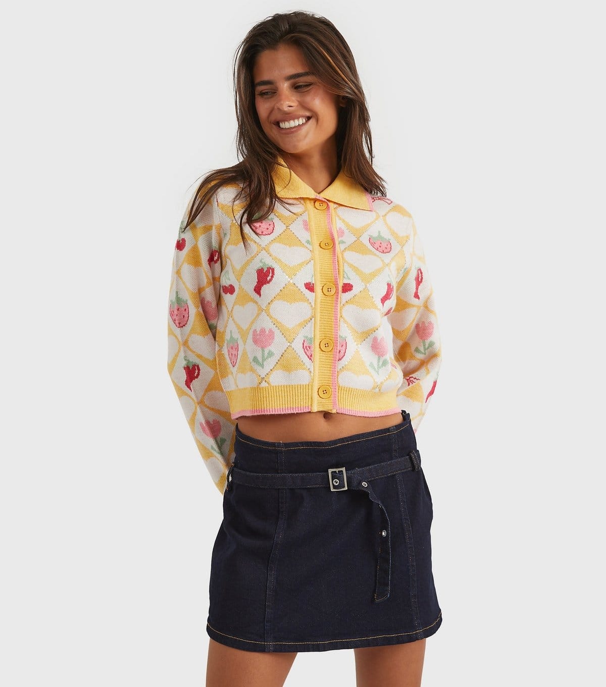 Playful knitted cardigan in bright yellow with a floral diamond motif. Features a classic collar and ribbed trims. Perfect for adding a colourful twist to your everyday staples.