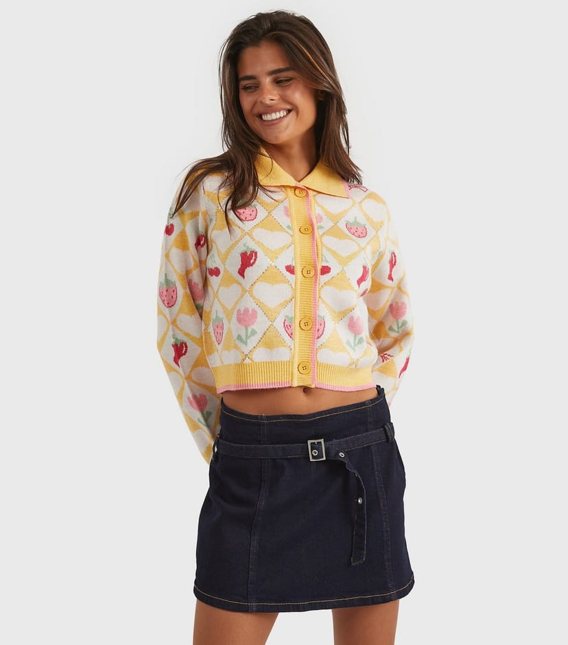The Skinnydip Bright Yellow Floral Diamond Knitted Cardigan is ideal for casual, everyday, date-night.