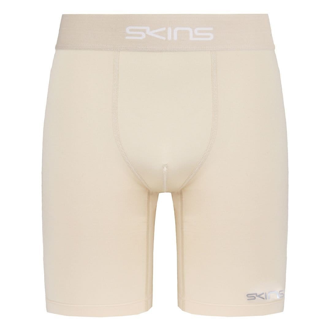 The Skins Men's DNAmic Force Light Beige Compression Shorts is available in sizes m, s, xs.