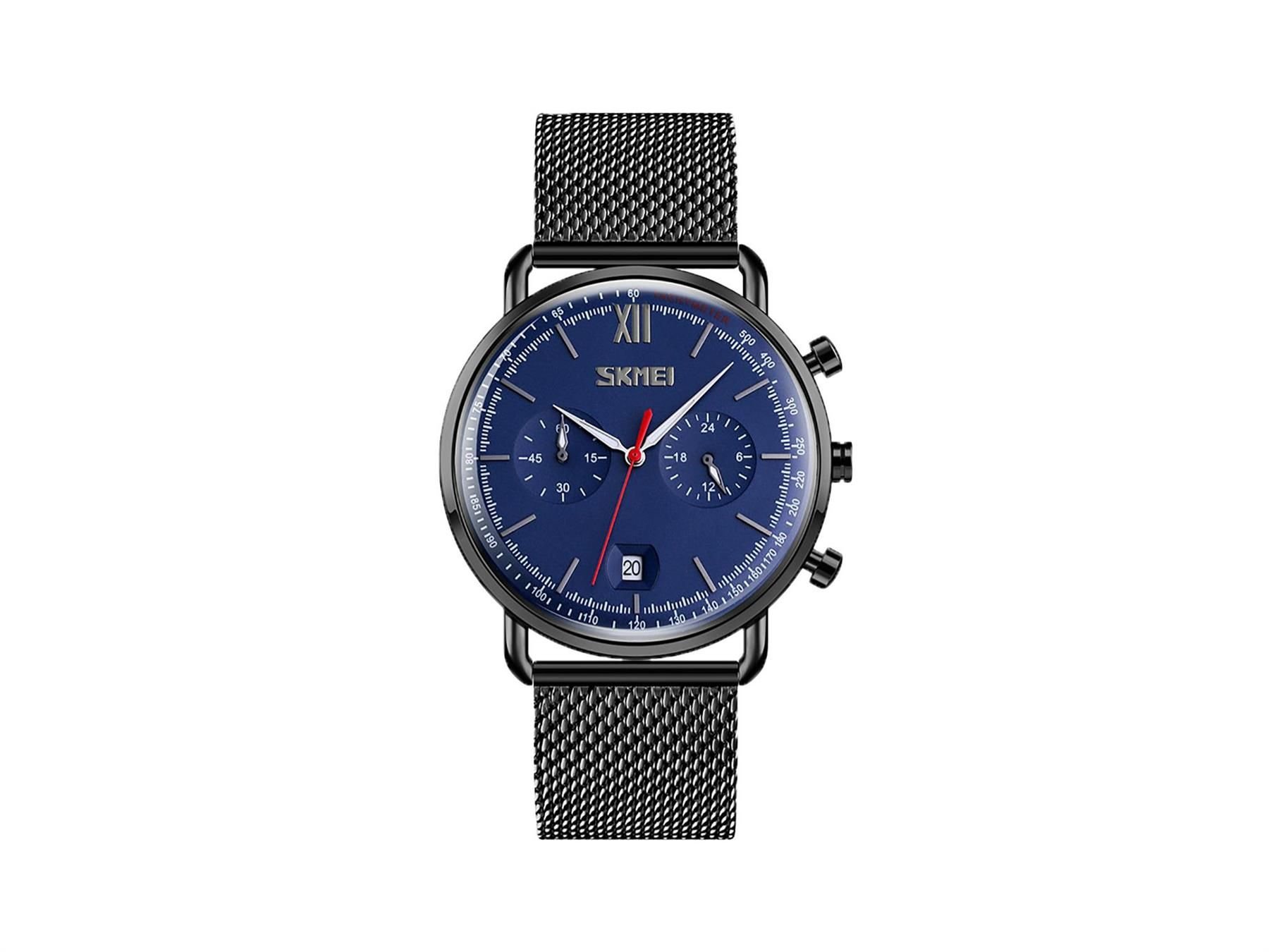 A modern blue mesh watch from Skmei, perfect for both formal occasions and everyday wear. The clear dial features hour markers and gold hands for easy time-telling. The red stopwatch seconds hand adds a sporty touch.