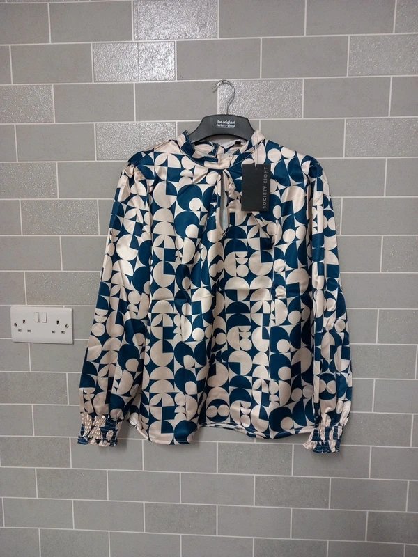 The Society Eight Satin Look Blouse in Cream and Navy is available in sizes M.