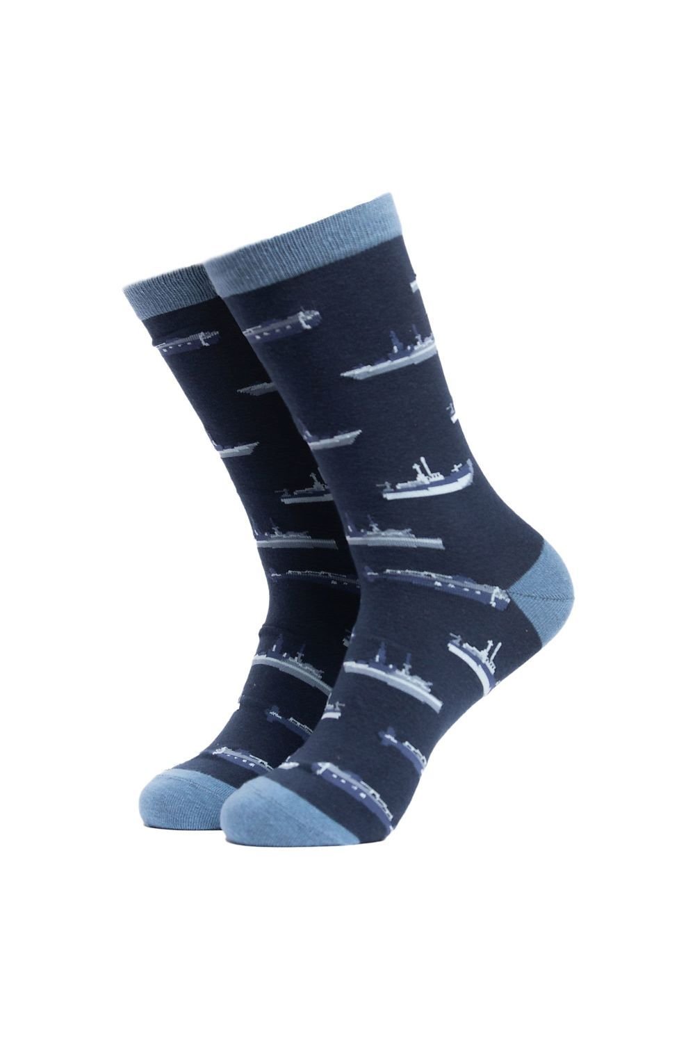 Novelty socks for men featuring a fun car pattern in navy blue. Made from a blend of cotton, polyester, and elastane for comfort and durability. Perfect for a casual, playful look.