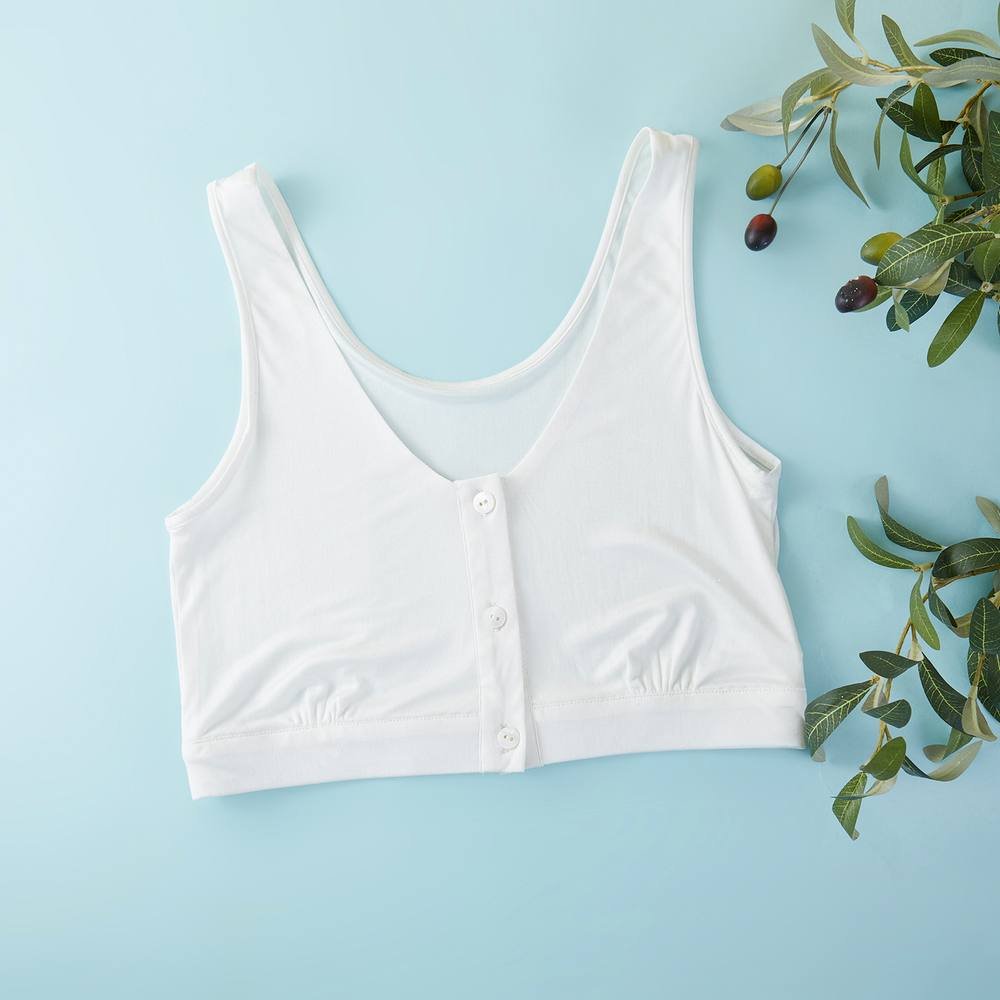 Comfortable silk bralette in pure white with a scoop neckline and buttoned front closure. Designed for everyday wear with a smooth, shiny texture.