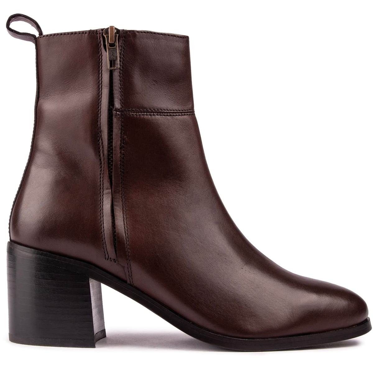 Sophisticated brown leather ankle boots with a round toe and block heel. The inside zip ensures easy on and off, while the polished leather upper adds a chic, urban touch. Perfect for elevating any outfit.