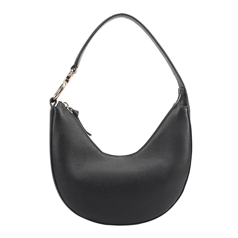 Elegant black leather shoulder bag with a crescent shape and gold-tone hardware. Designed for day-to-night wear, it offers a spacious interior and a secure zip closure.