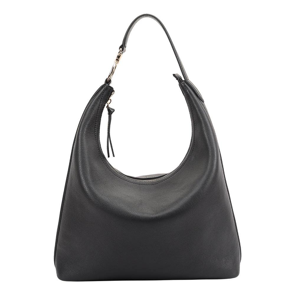Elegant black leather shoulder bag with a sculpted hobo shape. Features gold-tone hardware and a spacious interior with a secure zip closure. Ideal for everyday use, combining relaxed sophistication with timeless design.