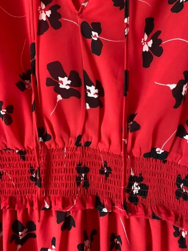 This red and black floral chiffon summer dress features an elasticated waist and 3/4 length sleeves. The mid-length design is fully lined, except for the chiffon sleeves. Perfect for summer occasions.