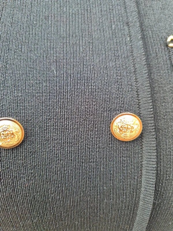 Stylish Sosandar fit and flare knit dress in black. Features a ribbed knit texture and decorative chain-detail buttons. Perfect for casual or smart-casual occasions.