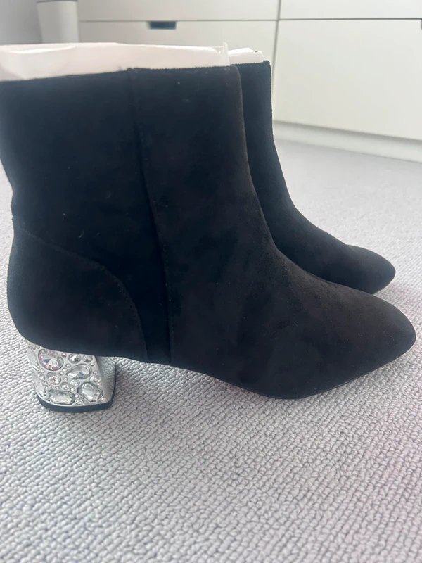 The Black Boots with Diamond Heel Embellishments is made from faux suede.