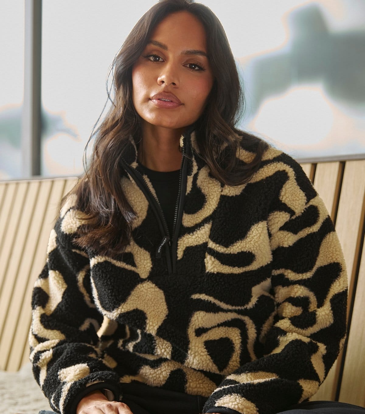 This South Beach jacket features a black and brown patterned borg fabric, offering a relaxed fit for comfort. Ideal for layering on cool days, it's perfect for casual meet-ups and city strolls.