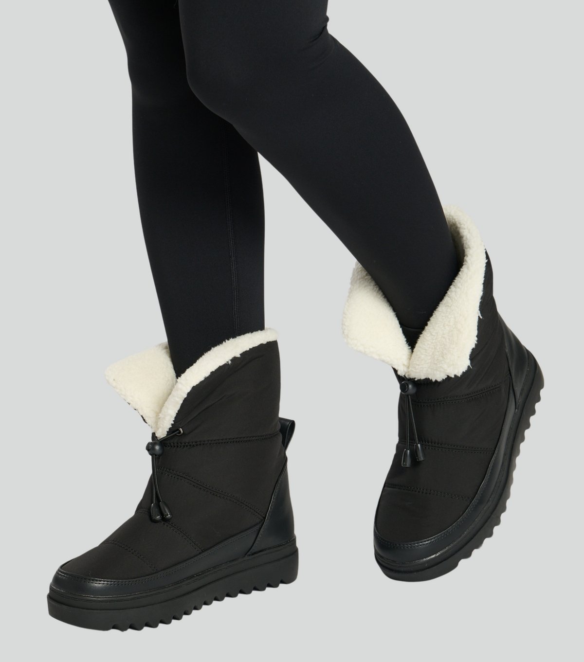Warm and stylish black snow boots with padded toggle fastening and faux fur lining. Perfect for cold weather with a chunky sole for added grip.