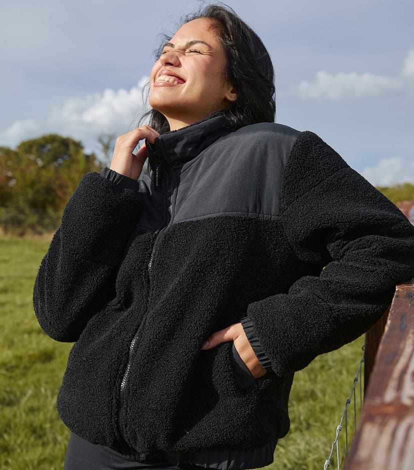 The South Beach Black Panelled Borg Jacket is made from polyester.