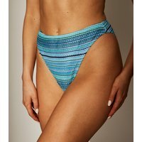 Stylish South Beach bikini bottoms in blue crochet with a striped pattern. High-waisted for a flattering fit. Ideal for beach days and pool parties.