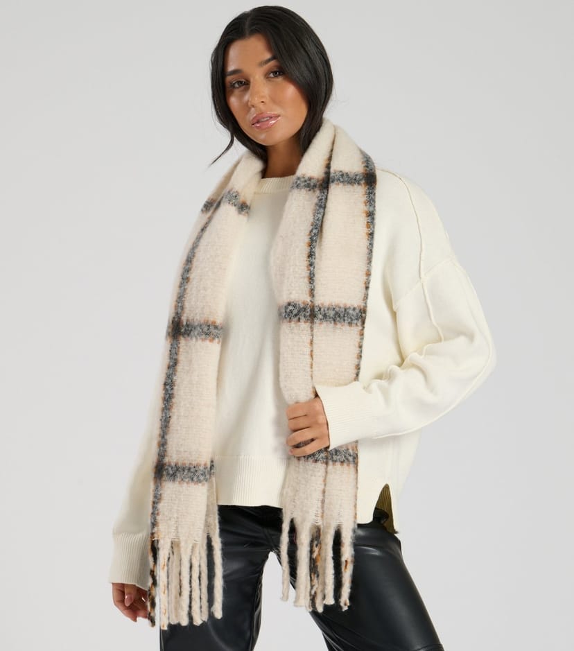 This cream checked fluffy scarf from South Beach features a fluffy texture and a checked pattern with fringed trims. Ideal for adding a touch of warmth and style to your winter outfits.