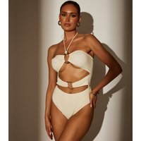 Stylish South Beach swimsuit in cream with a textured fabric. Features a halterneck design with cut-outs and sculptural ring details. Ideal for beach outings and pool parties.