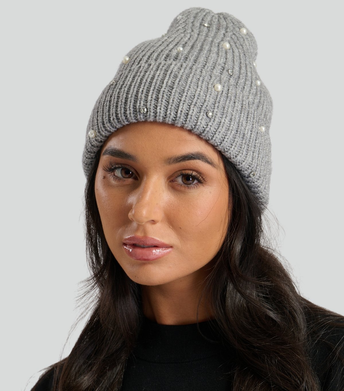 Stylish grey ribbed beanie hat from South Beach featuring faux pearl and diamanté studs. Made from ribbed knit fabric, it's perfect for adding a touch of glamour to your winter wardrobe.