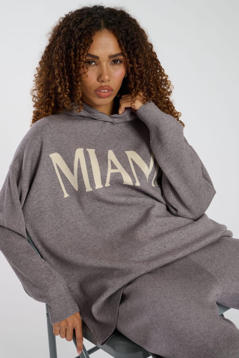 Discover a celebration of comfort, style, and versatility, designed for those who embrace both casual and elevated everyday wear. Whether you're lounging at home, running errands, or meeting friends for brunch, this piece ensures you stay stylish and comfortable throughout the day. Featuring a grey knit fabric with a hooded neckline and embroidered 'Miami' text.