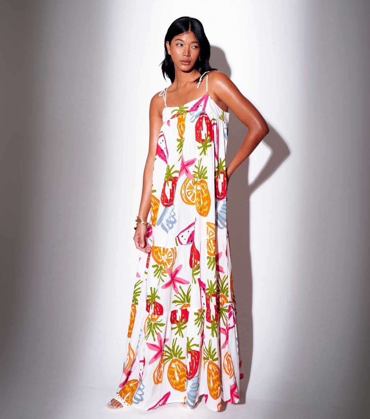 Resort-ready maxi dress from South Beach featuring a playful fruit print and adjustable tie straps. Made from 100% breathable cotton, this dress is perfect for summer events.